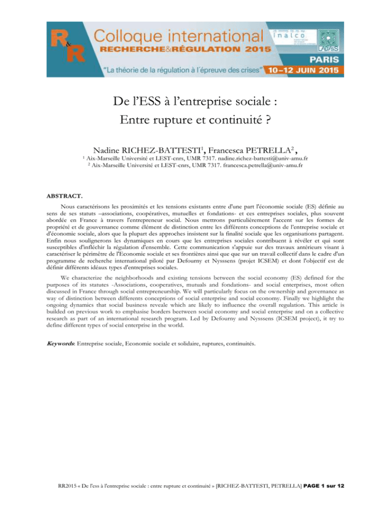 RR2015 « De l'ess à l'entreprise sociale : entre rupture et continuité ?» [RICHEZ-BATTESTI, PETRELLA] PAGE 4 sur 12