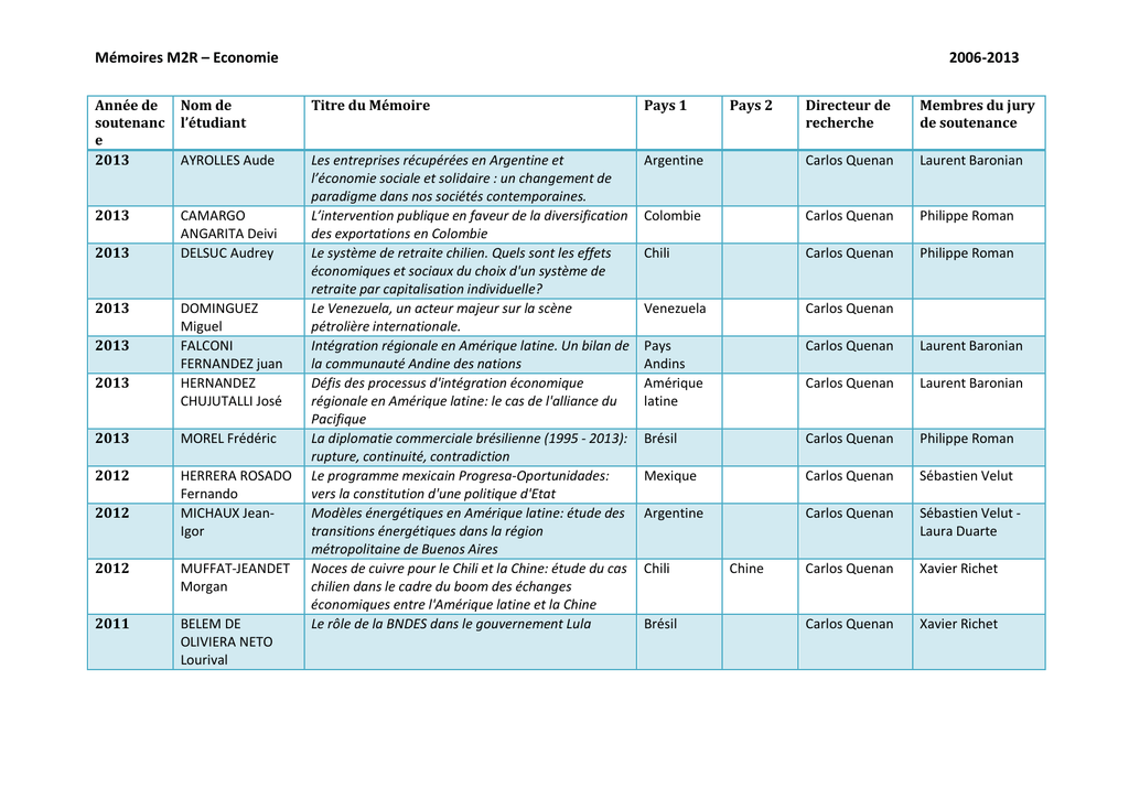 Titre du Mémoire Pays 1 Pays 2 Directeur de