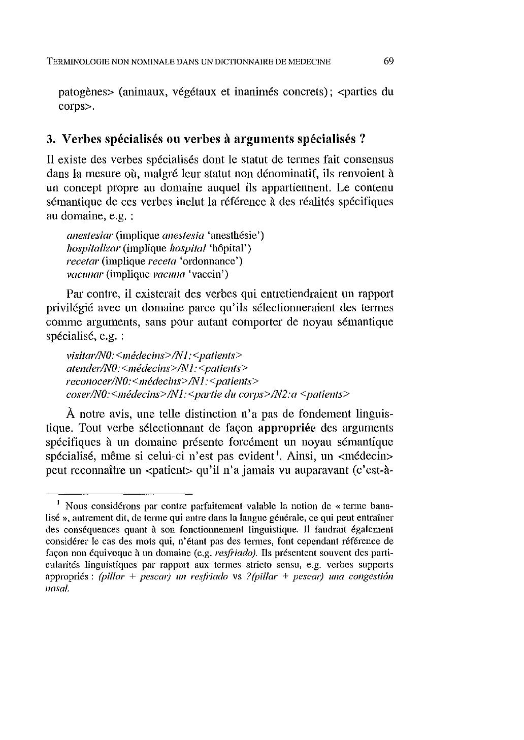 Verbes spécialisés ou verbes àarguments spécialisés?