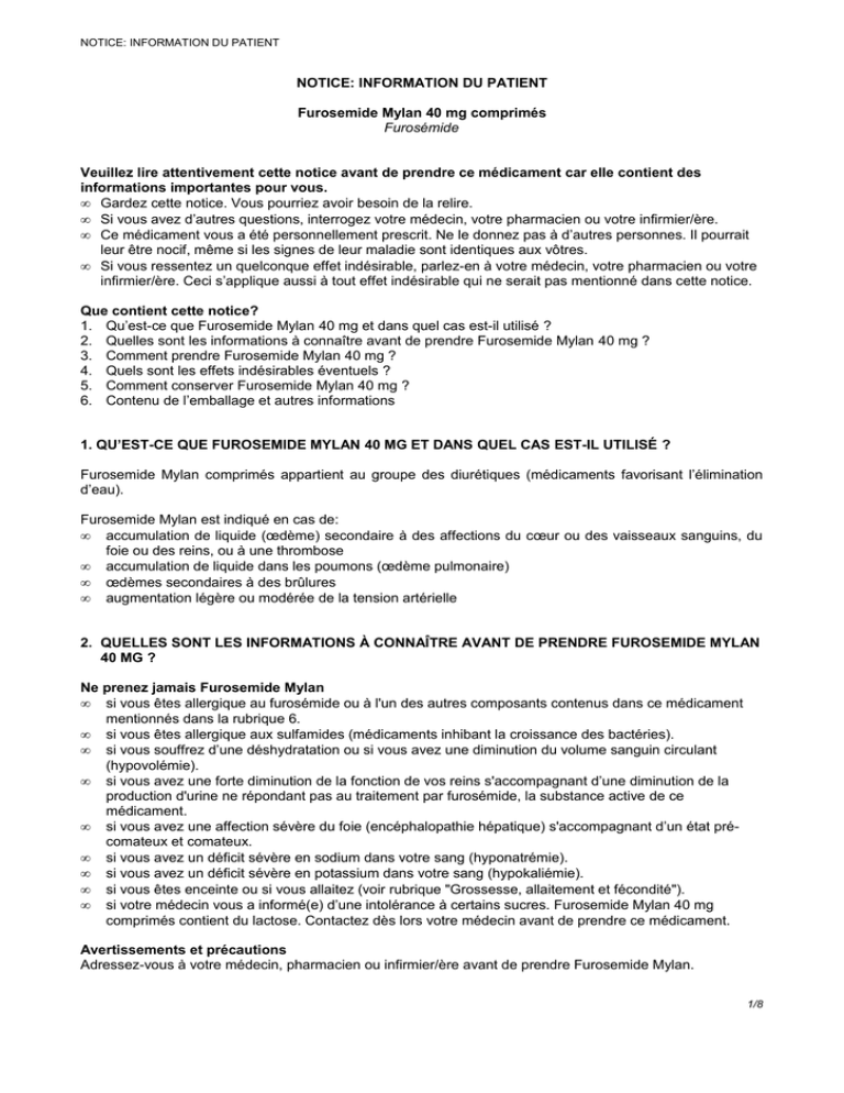 NOTICE: INFORMATION DU PATIENT Furosemide Mylan 40 mg