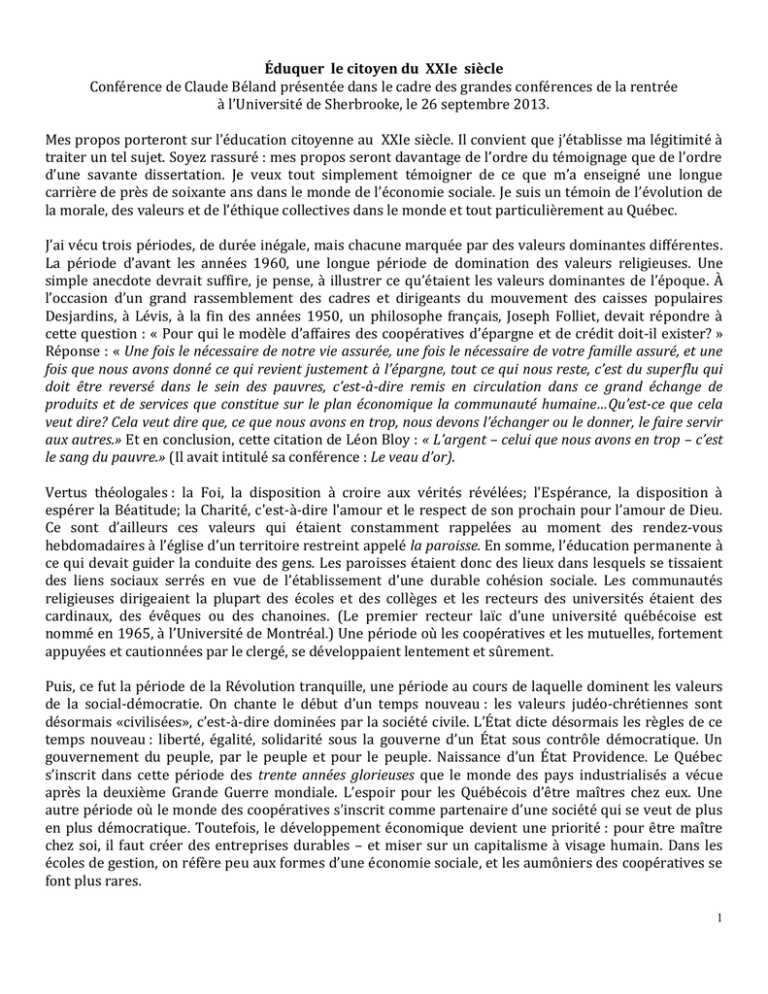 des valeurs religieuses d’avant les années 1950, puis la Révolution tranquille et un Québec social-