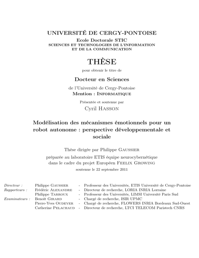 Directeur : Philippe Gaussier - Professeur des Universités, ETIS Université de Cergy-Pontoise