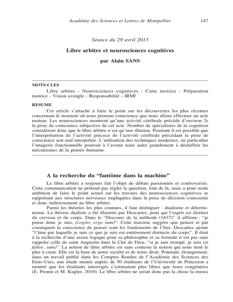 machine” (le fantôme dans la machine), (Eccles, 1953, 1994). Actuellement des