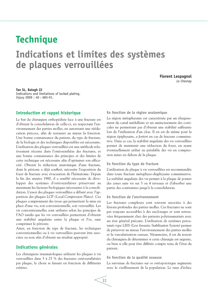 de l’ostéoporose. L’intérêt de la plaque verrouillée réside