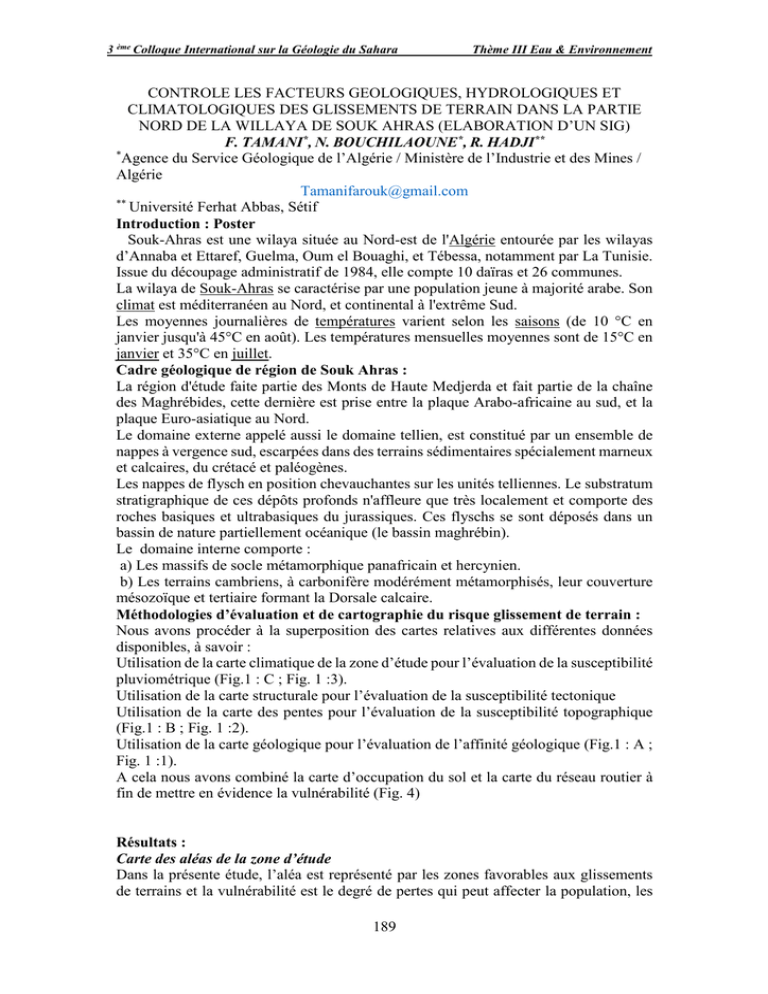 3ème Colloque International sur la Géologie du Sahara Thème III Eau & Environnement