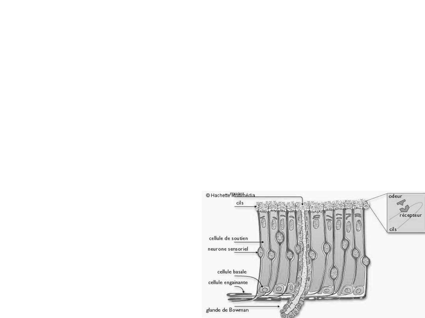 Epithelium olfactif : neurones avec projections cils (8-20 / neurone) dans mucus