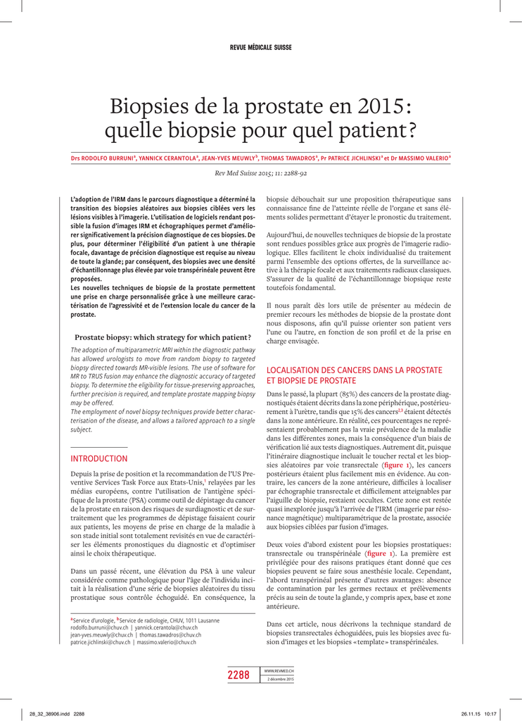 Drs RODOLFO BURRUNI a, YANNICK CERANTOLA a, JEANYVES MEUWLY b, THOMAS TAWADROS a, Pr PATRICE JICHLINSKI a et Dr MASSIMO VALERIO a