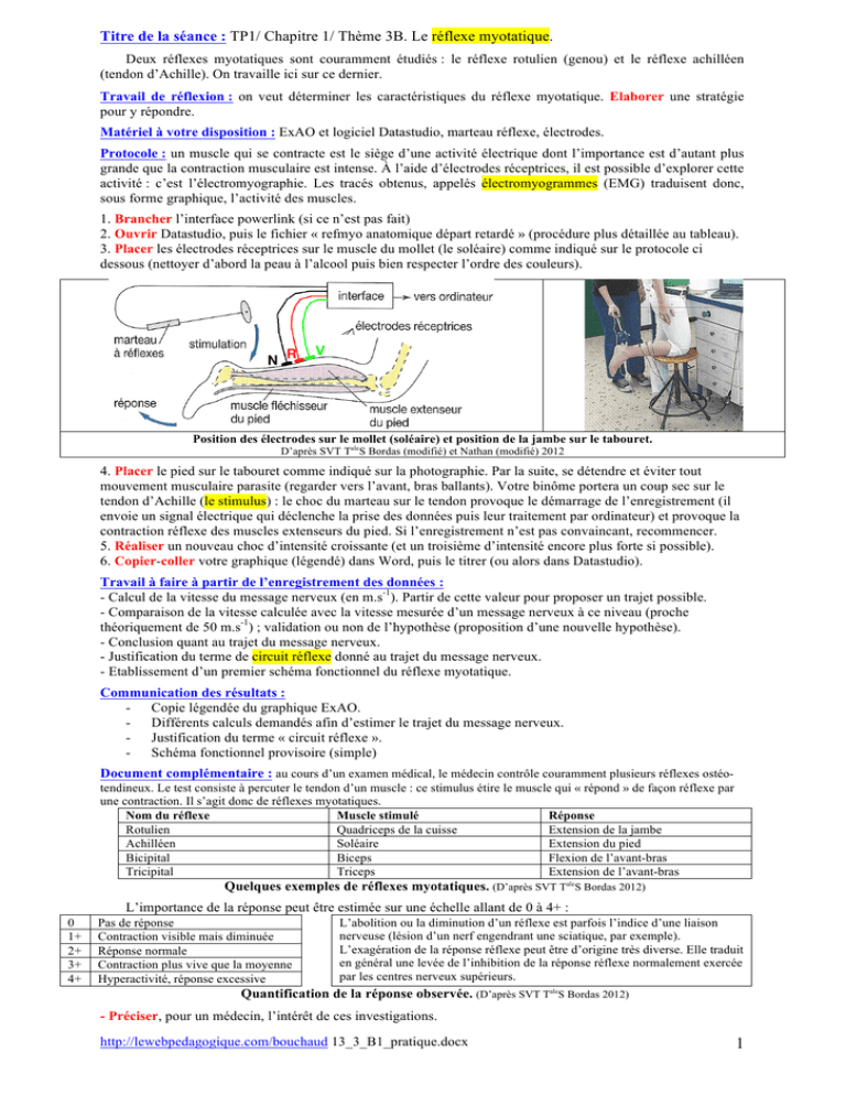 Titre de la séance : TP2/ Chapitre 1/ Thème 3B. Les voies nerveuses du réflexe myotatique.