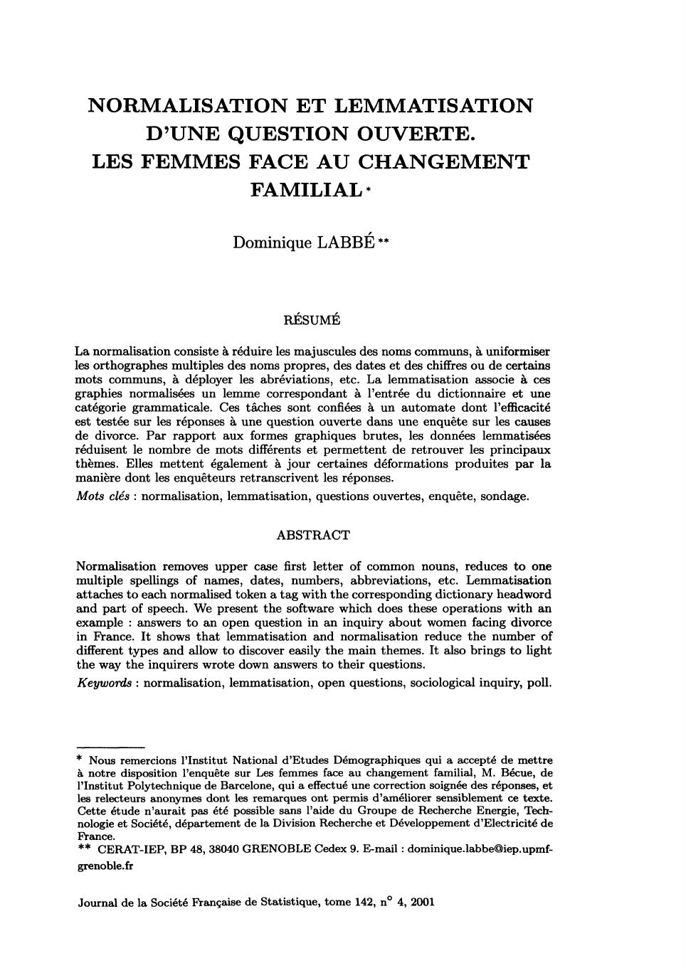 NORMALISATION ET LEMMATISATION D'UNE QUESTION OUVERTE
