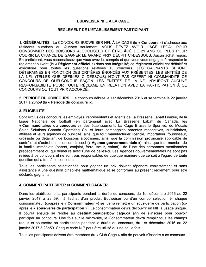 concours, les entités de la NFL (telles que définies ci-dessous), des établissements La Cage