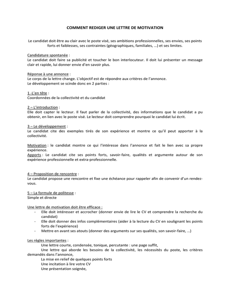 Lecandidatdoitêtreauclairaveclepostevisé,sesambitionsprofessionnelles,sesenvies,sespoints
