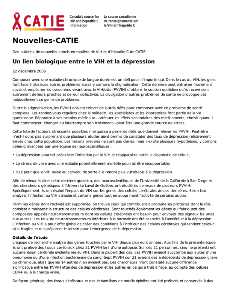 elles subissent une réduction de leurs taux de neurotransmetteurs, il se peut que les PVVIH soient plus vulnérables à