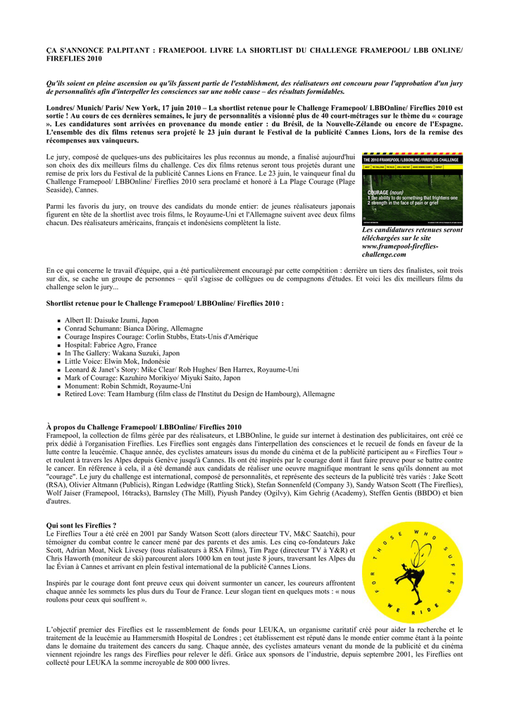 Shortlist retenue pour le Challenge Framepool/ LBBOnline/ Fireflies 2010 :