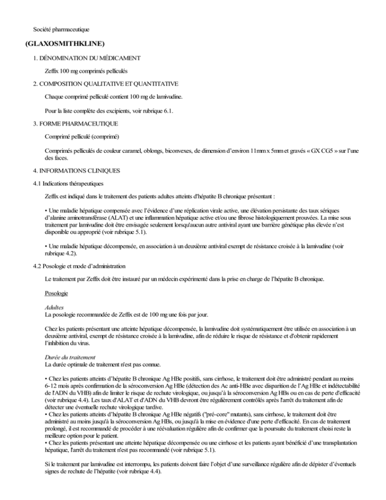 observés. Les patients pour lesquels le traitement par Zeffix est arrêté doivent faire l’objet d’une surveillance clinique régulière, ainsi