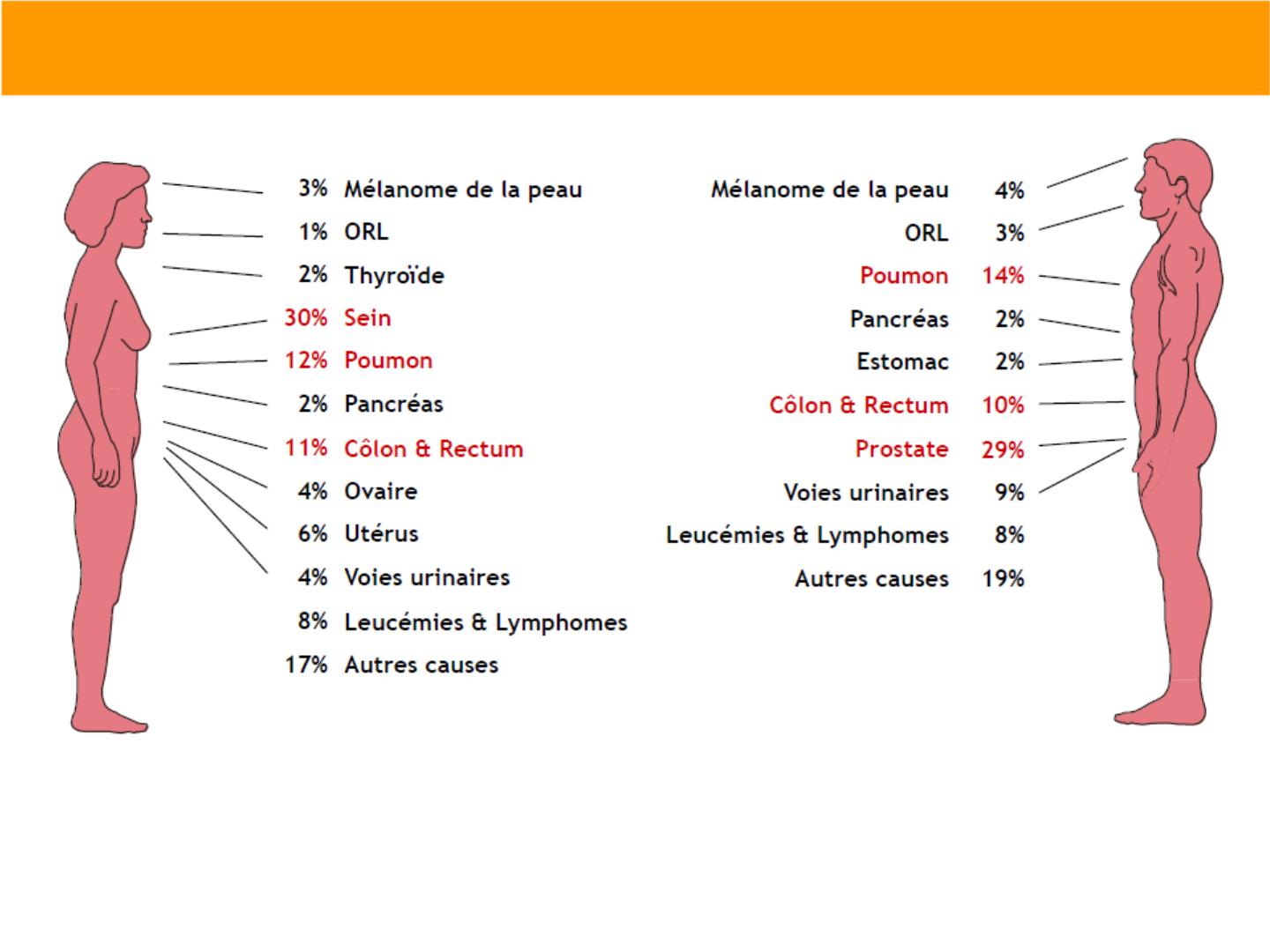 Chez la femme : pour 55 % aux cancers du sein et, pour 12 %, aux cancers du poumon