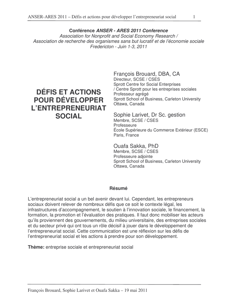 ANSER-ARES 2011 – Défis et actions pour développer l’entrepreneuriat social 4