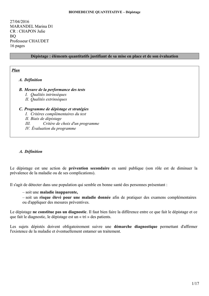 BIOMEDECINE QUANTITATIVE – Dépistage