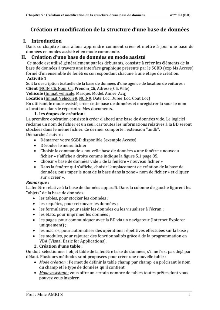 Chapitre 5 : Création et modification de la structure d’une base de données 4ième SI (BD)
