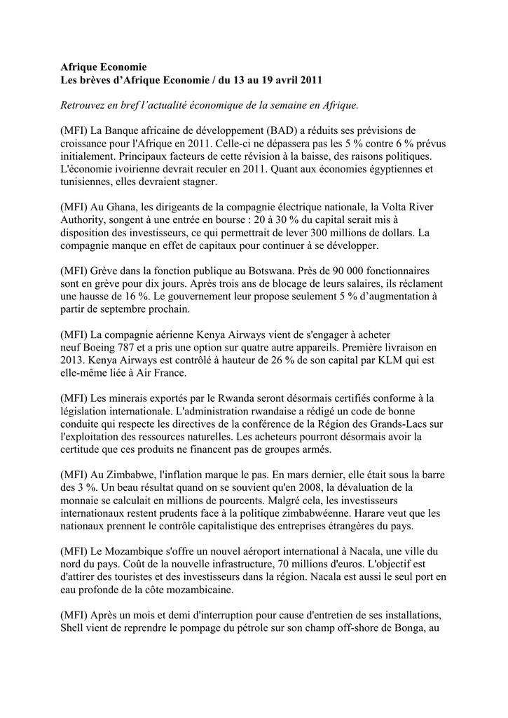 Les brèves d’Afrique Economie / du 13 au 19 avril 2011
