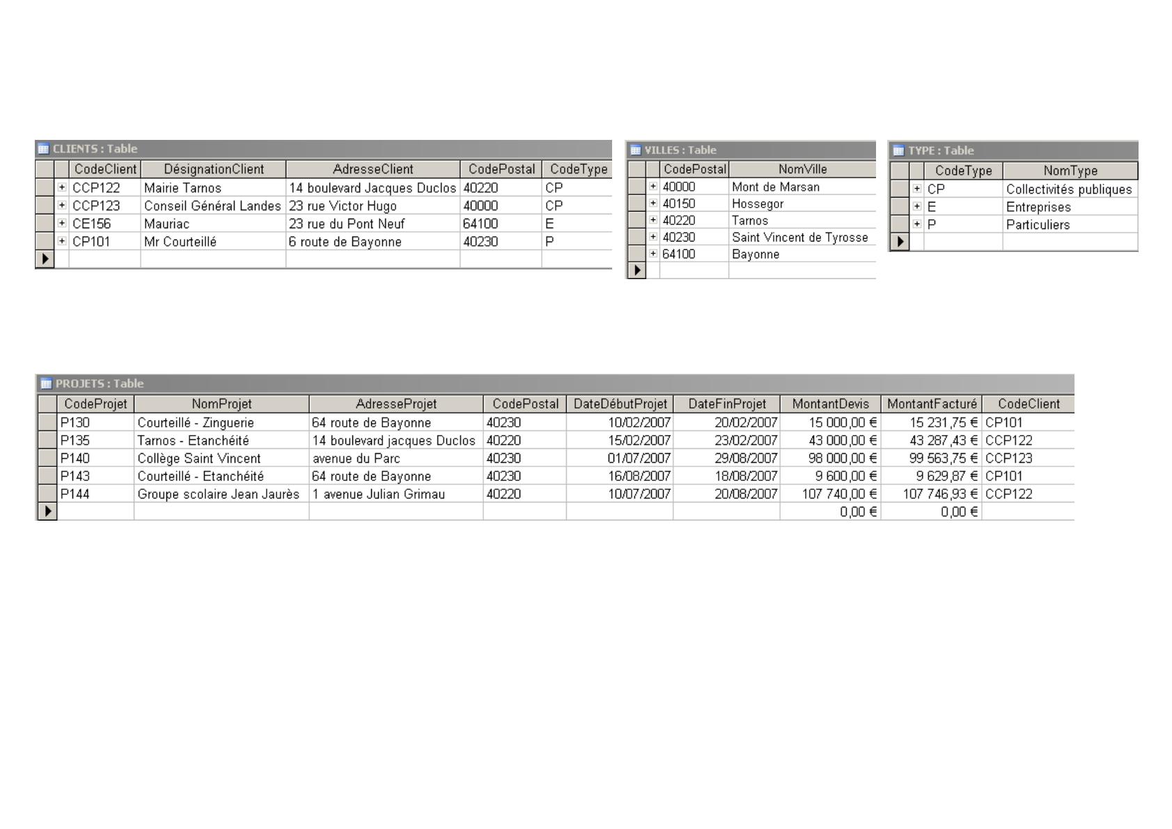 PROJETS (CodeProjet, NomProjet, AdresseProjet, DateDébutProjet, DateFinProjet, MontantDevis,