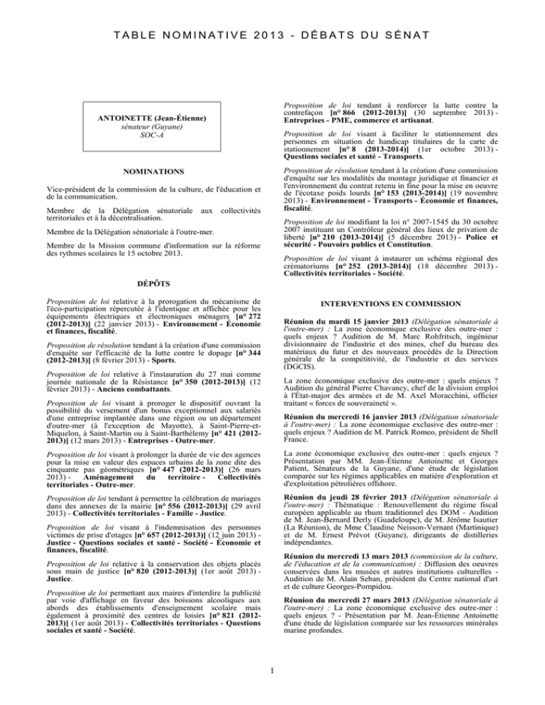 TABLE NOMINATIVE 2013 - DÉBATS DU SÉNAT