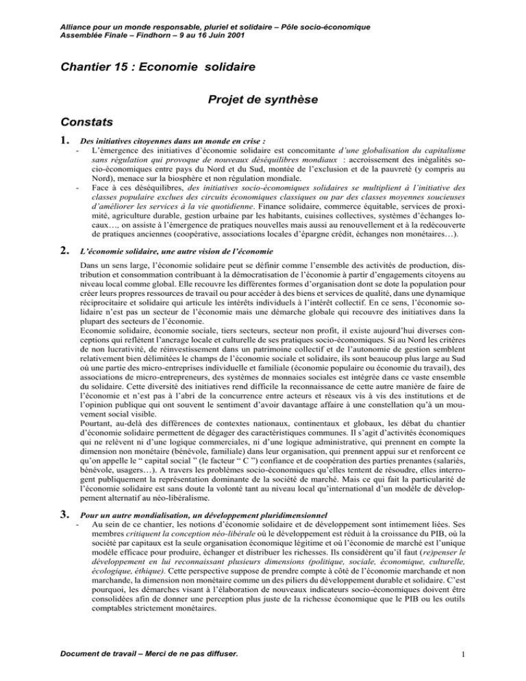 composantes de l’économie solidaire aux niveaux local, national et mondial. Cela passe ensuite par une recon-