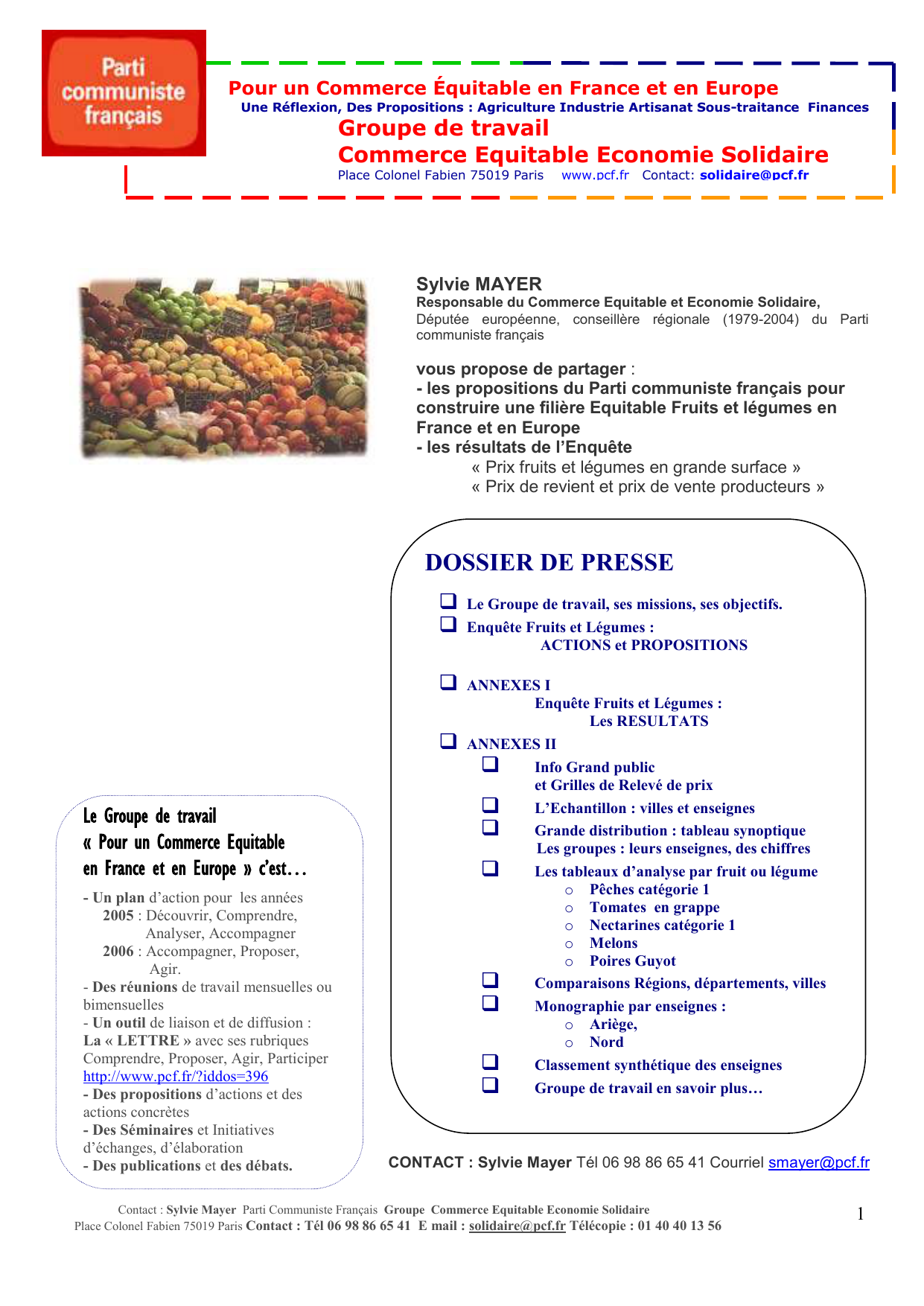 Contact : Sylvie Mayer Parti Communiste Français Groupe Commerce Equitable Economie Solidaire