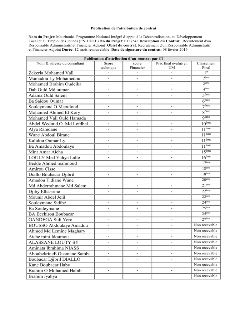 et Financier Adjoint Durée: 12 mois renouvelable Date de signature du contrat: 08 février 2016