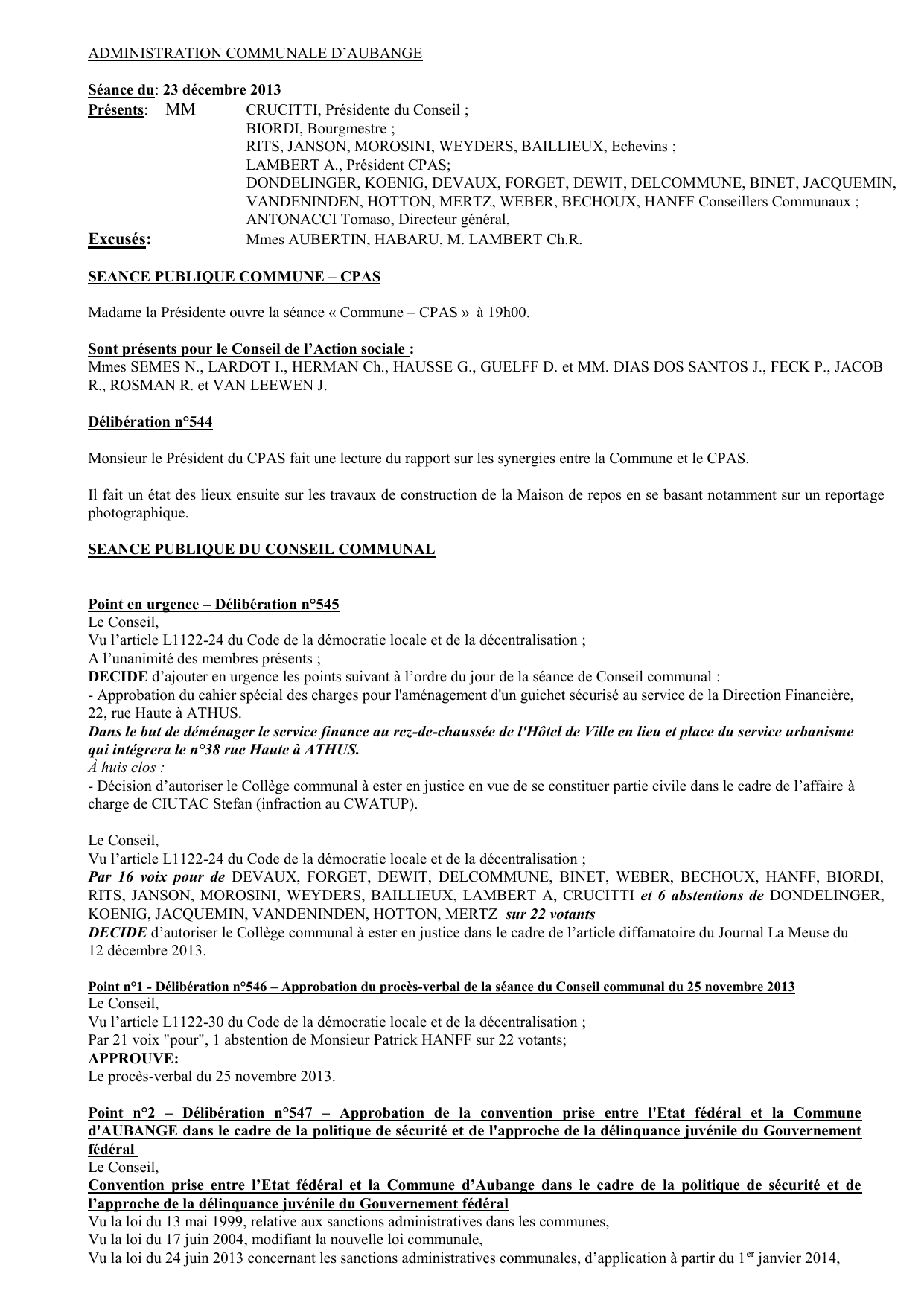 Vu l’arrêté ministériel du 22/11/2013 portant octroi d’une subvention à la Commune d’Aubange dans le cadre de la