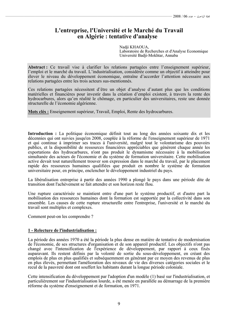L'entreprise, l'Université et le Marché du Travail en Algérie : tentative d'analyse _________________________________________________________________