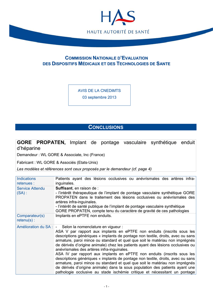 en dessous du genou) avec l’implant de pontage GORE PROPATEN. La