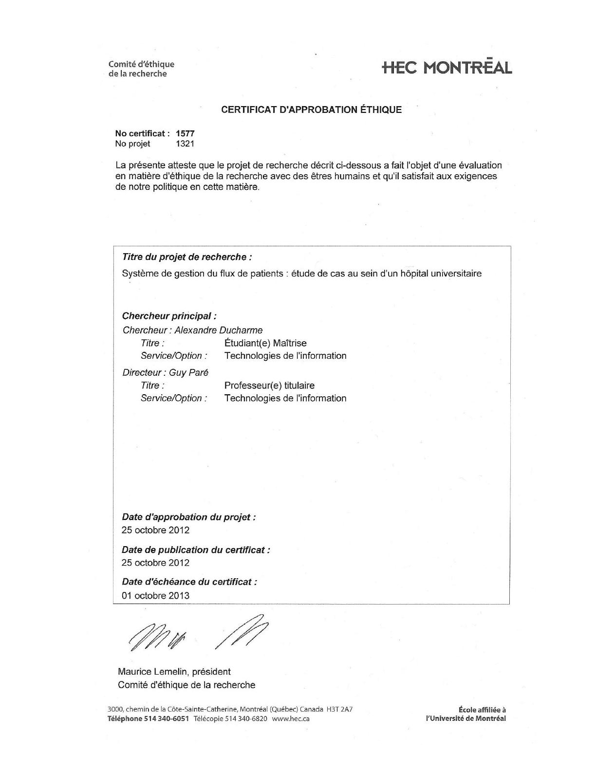Mémoire de maîtrise d’Alexandre Ducharme i
