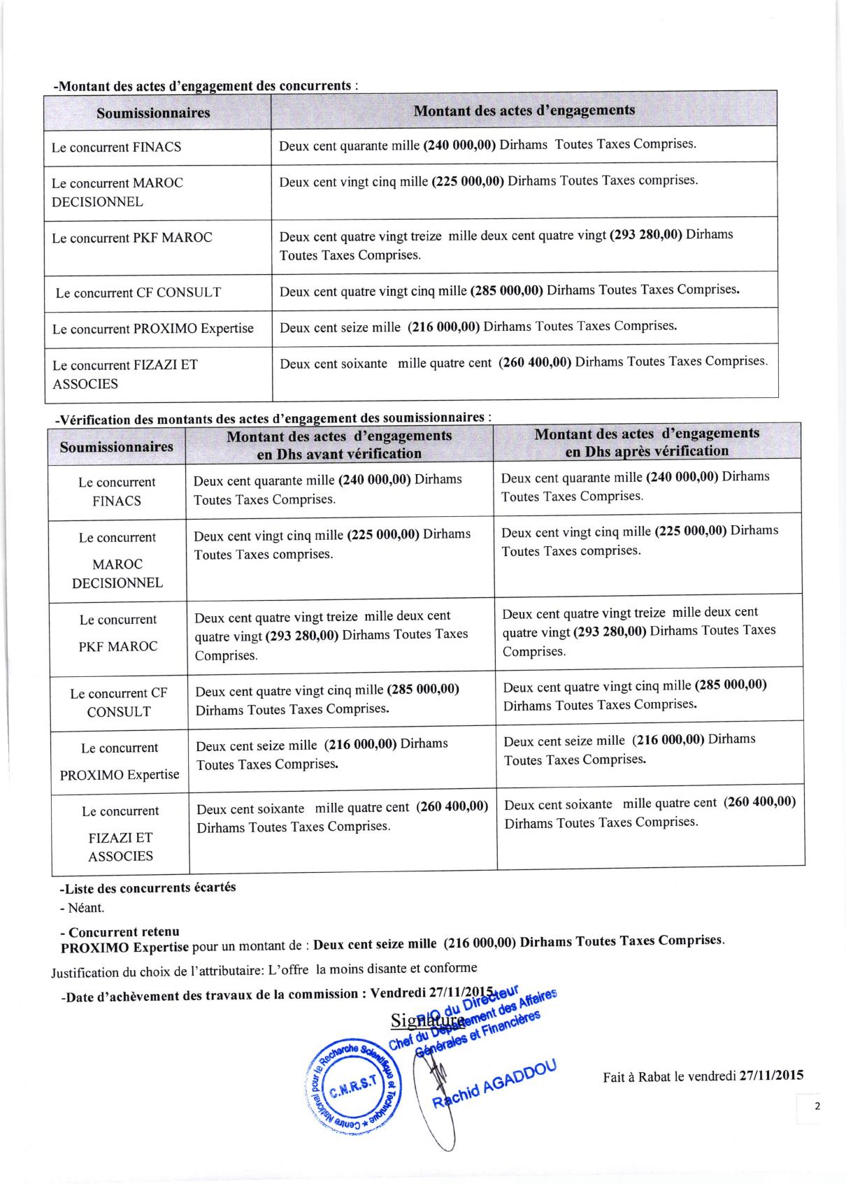 Le concurrent PROXIMO Expertise Deux cent seize mille (216 000,00) Dirhams Toutes Taxes Comprises.