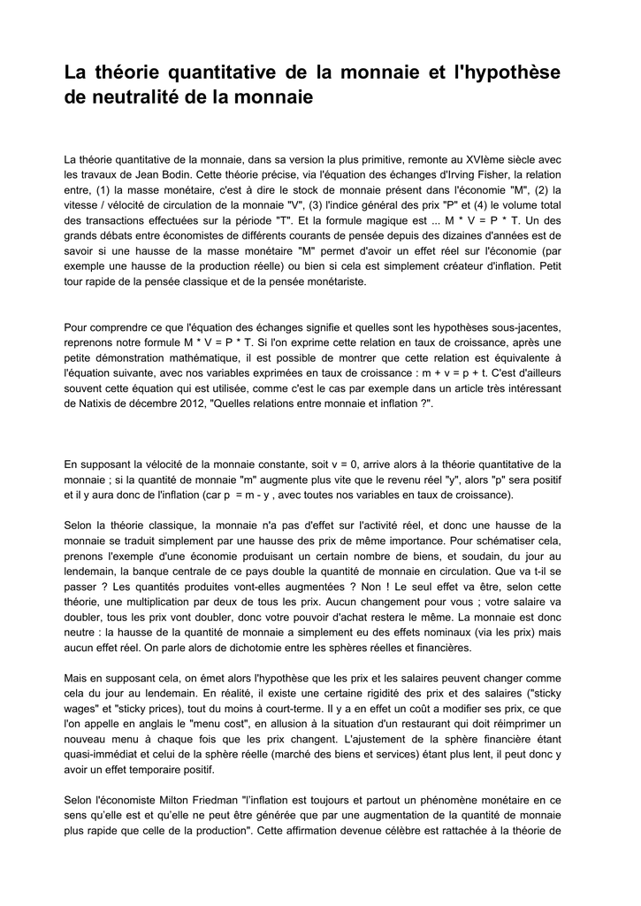 les travaux de Jean Bodin. Cette théorie précise, via l'équation des échanges d'Irving Fisher, la relation