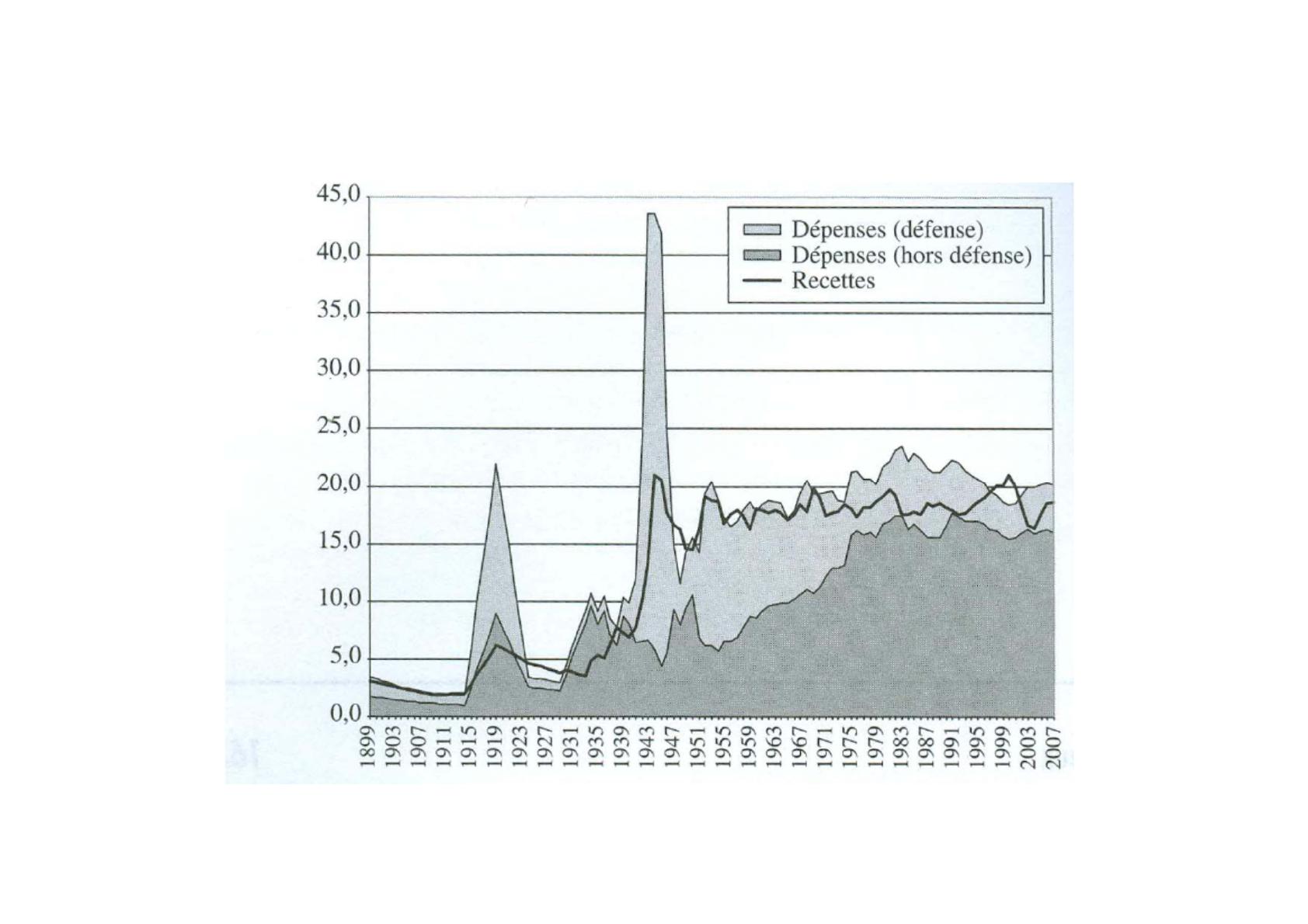 DépensesetrecettesfédéralesauxÉtatsUnis,en%duPIB,18992007