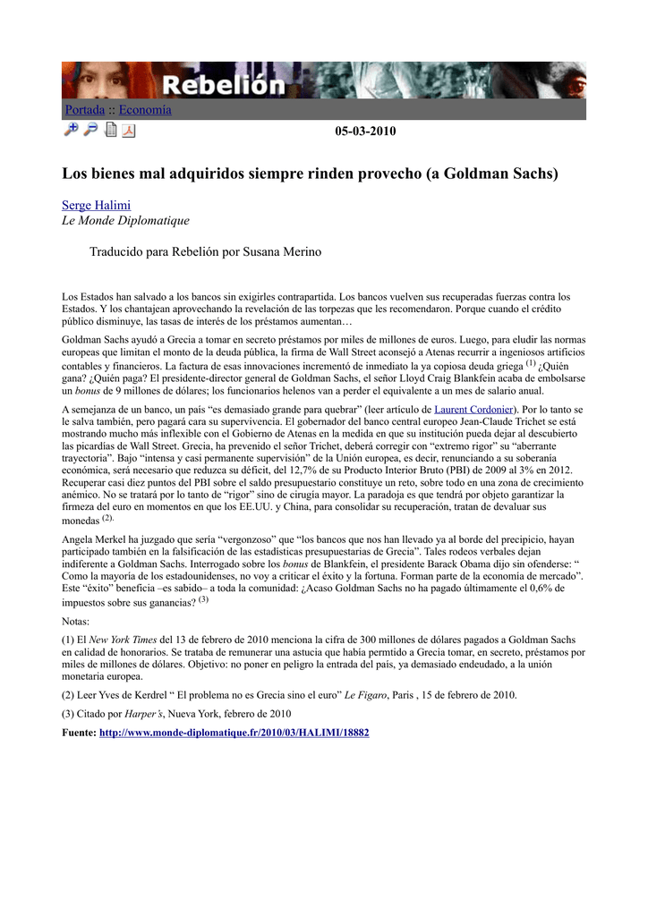 (1) El New York Times del 13 de febrero de 2010 menciona la cifra de 300 millones de dólares pagados a Goldman Sachs