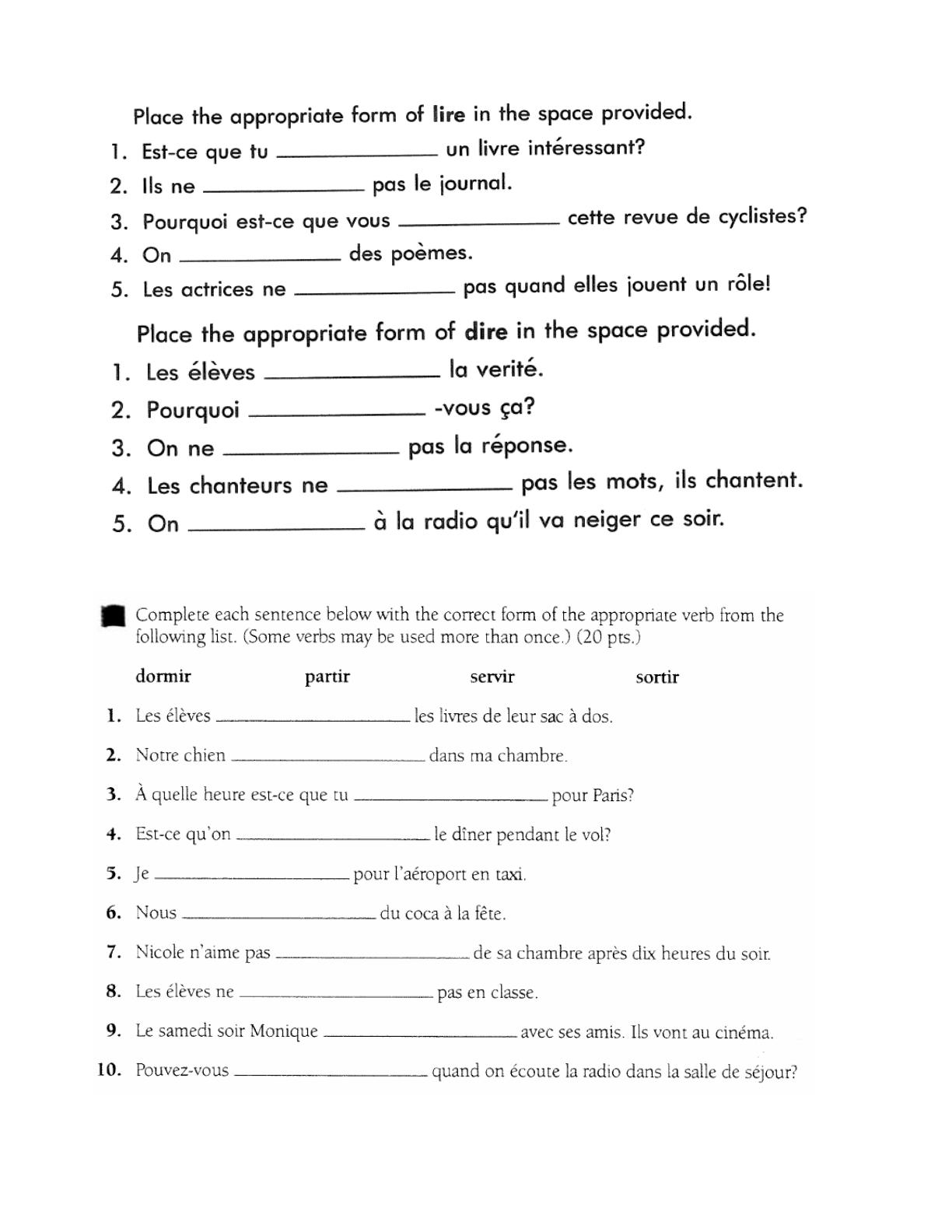 croire, voir, sortir, partir, dormir, servir, écrire, lire, dire, recevoir, devoir, boire, falloir (il faut),