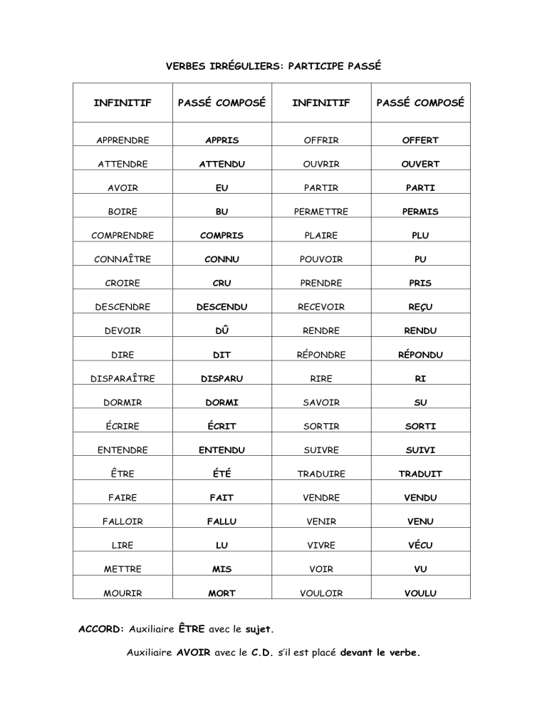 VERBES IRRÉGULIERS: PARTICIPE PASSÉ