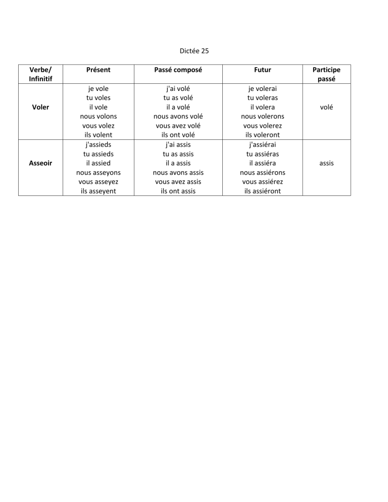Dictée 25 Verbe/ Infinitif Présent Passé composé Futur Participe