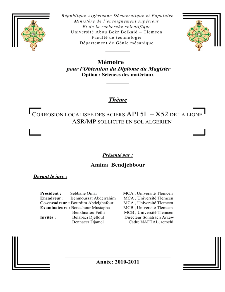 Co-encadreur : Bourdim Abdelghafour MCA , Université Tlemcen