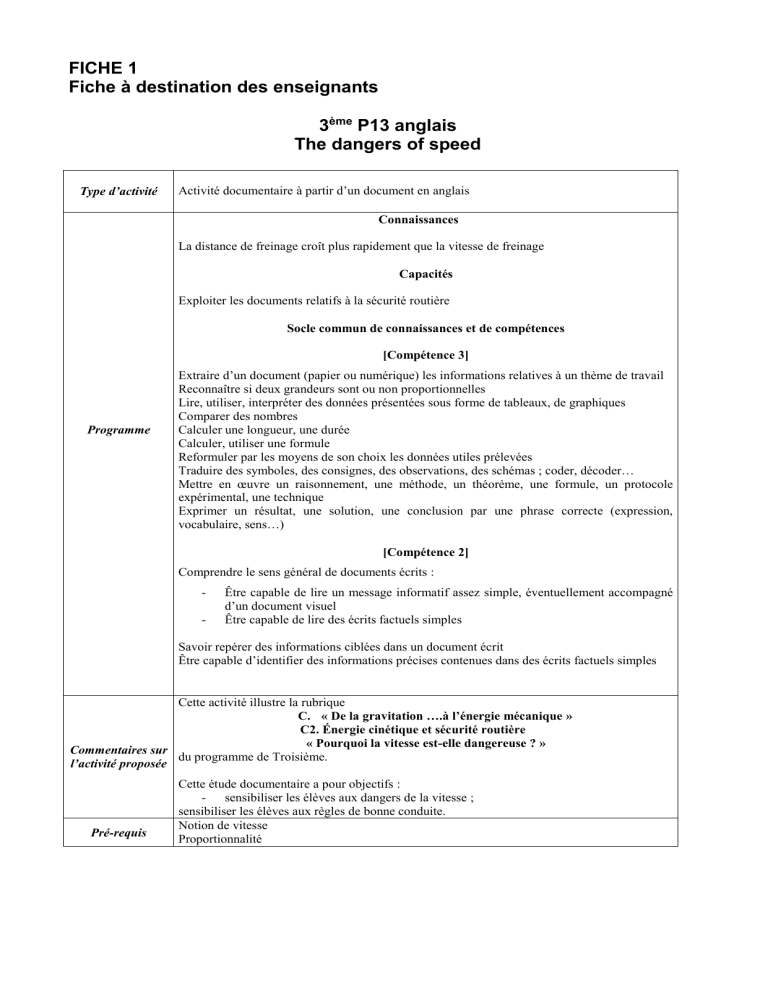 - sensibiliser les élèves aux dangers de la vitesse ;