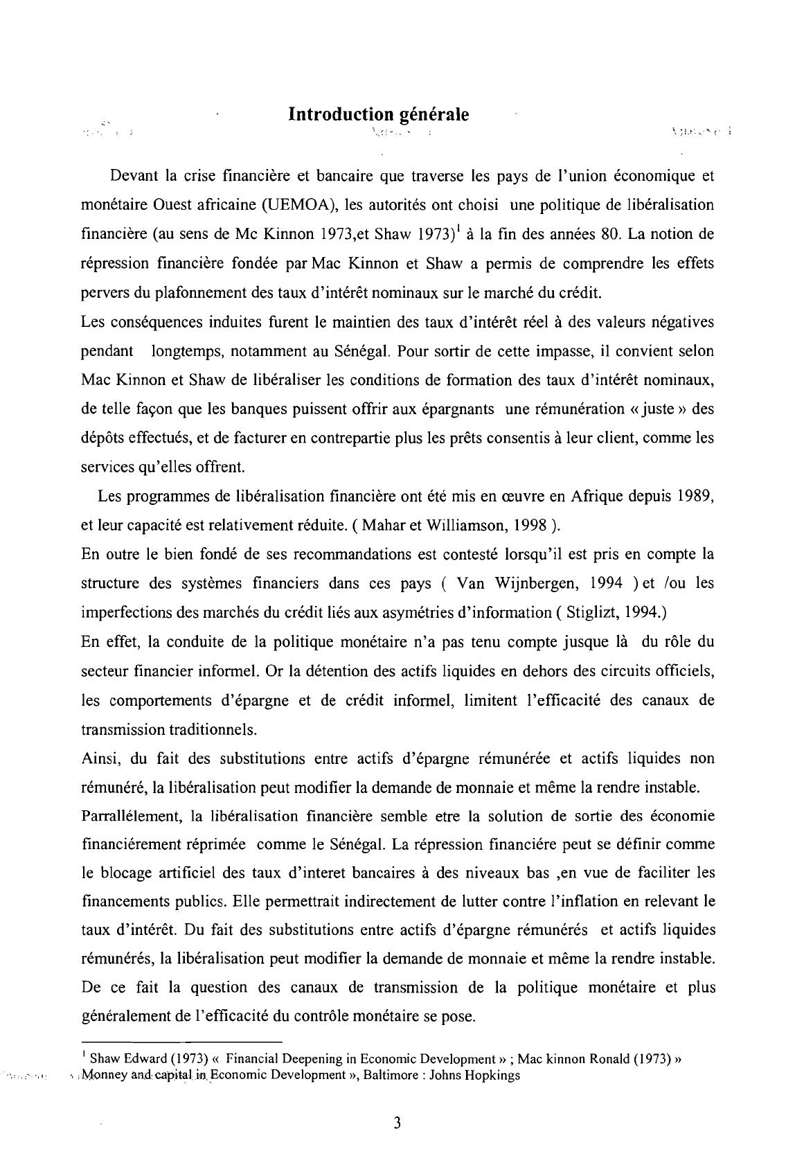 financière (au sens de Mc Kinnon 1973,et Shaw 1973)' àla fin des années 80. La notion de