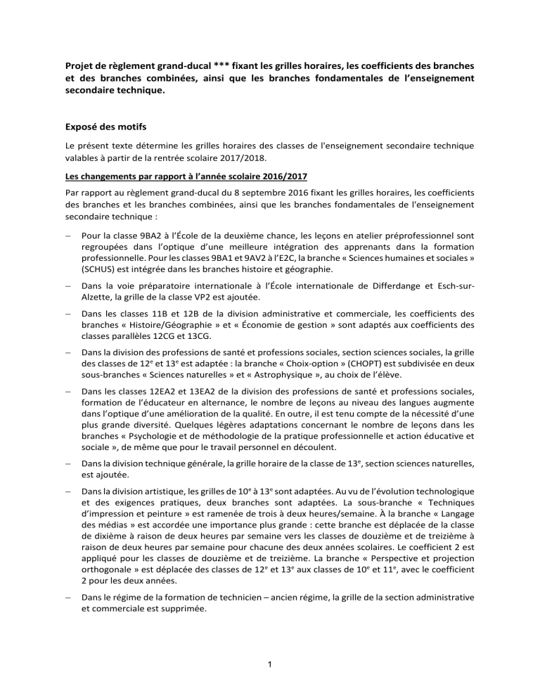 Projet de règlement grand-ducal *** fixant les grilles horaires, les coefficients des branches