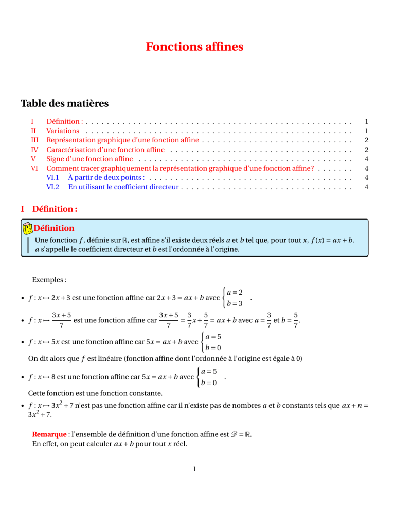 Soit f:x7→ ax +bune fonction affine. La représentation graphique d’une fonction affine est une droite,