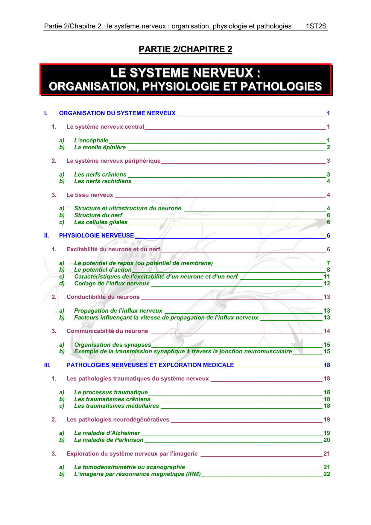 Partie 2/Chapitre 2 : le système nerveux : organisation, physiologie et pathologies 1ST2S