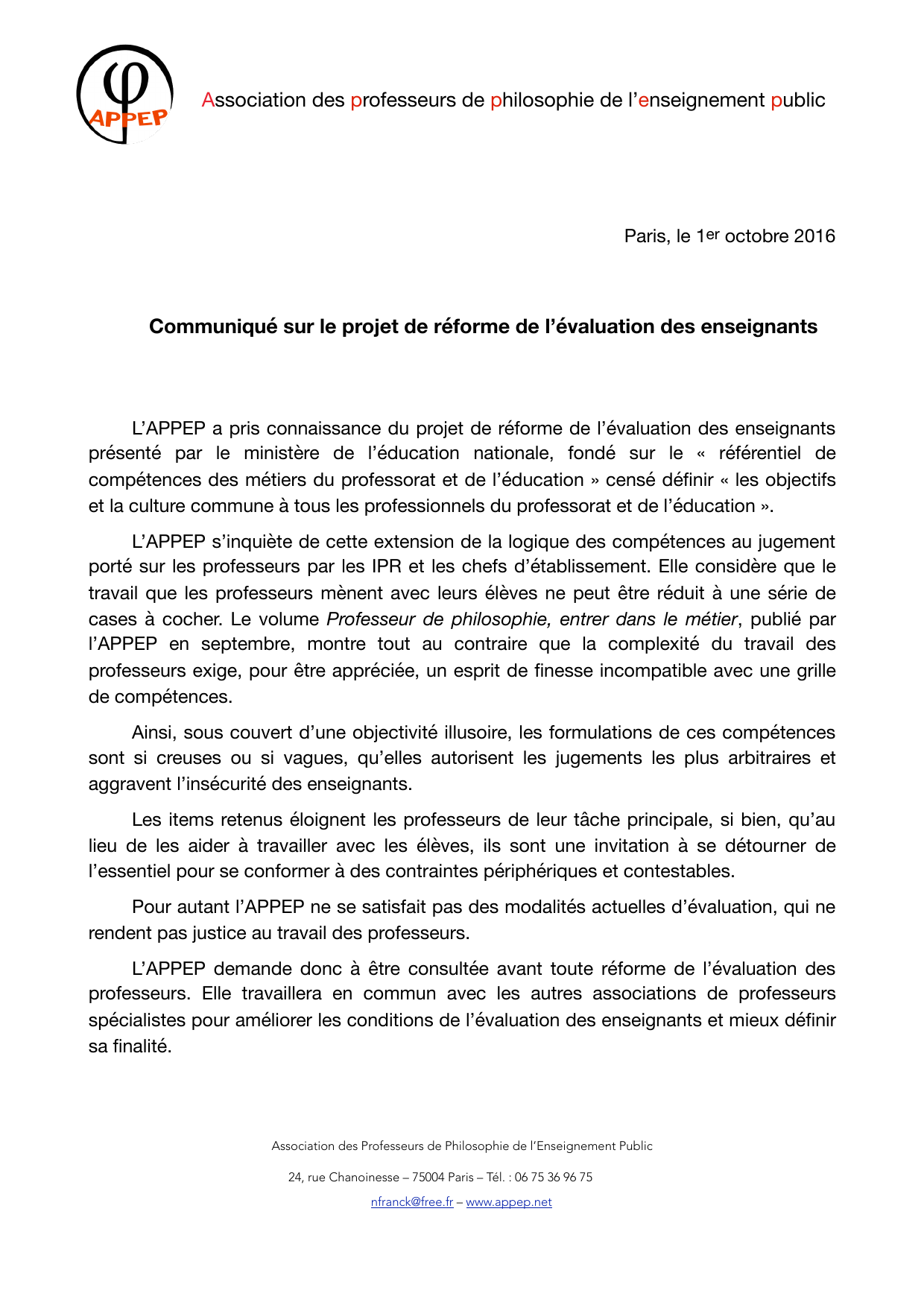L’APPEP demande donc à être consultée avant toute réforme de l’évaluation des
