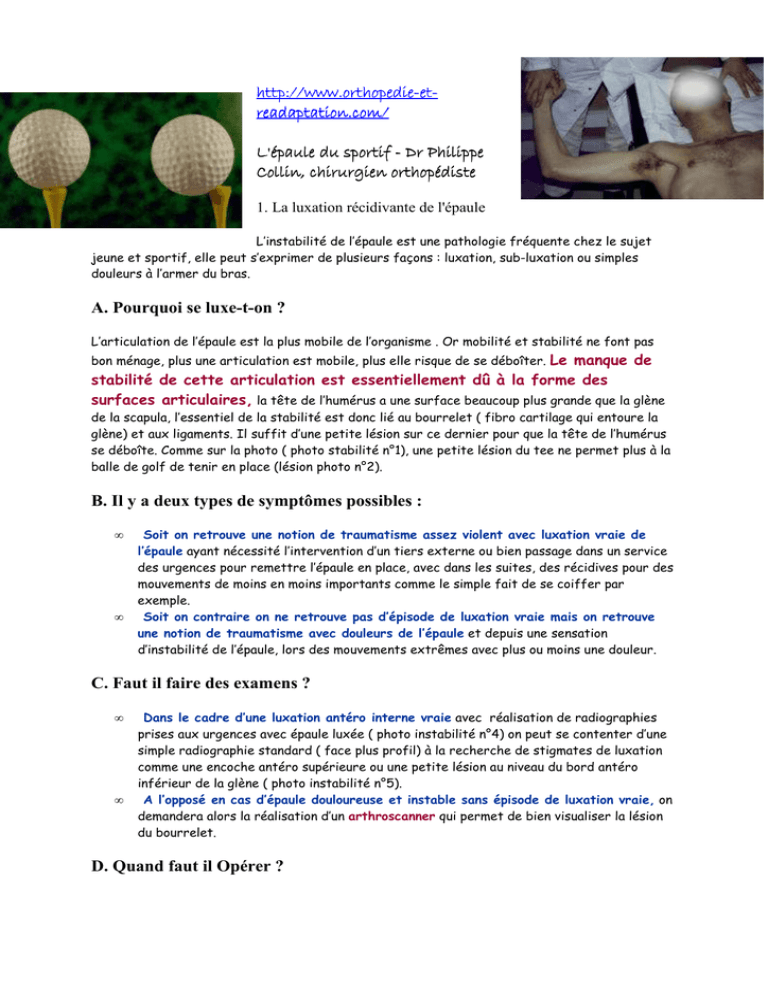 jeune et sportif, elle peut s’exprimer de plusieurs façons : luxation, sub-luxation ou simples