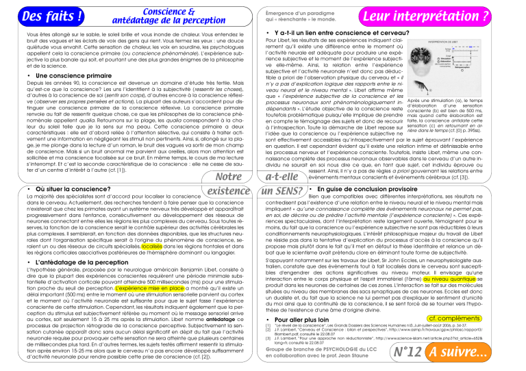 ne” pour élaborer la sensation consciente. Quand celle-ci est “prête”, la conscience repart en arrière