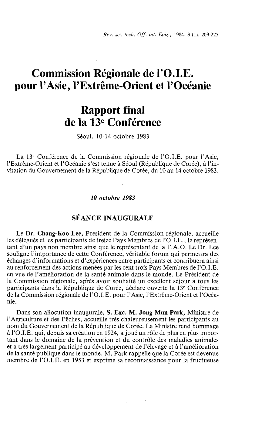 la Commission régionale de l'O.I.E. Le Directeur Général adresse ses très sin-