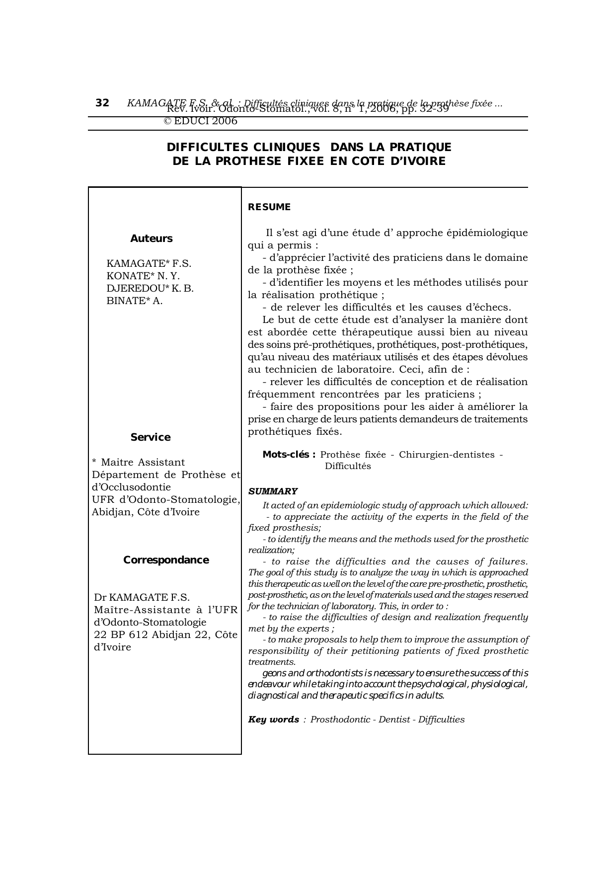 36 KAMAGATE F.S. & al. : Difficultés cliniques dans la pratique de la prothèse fixée ...